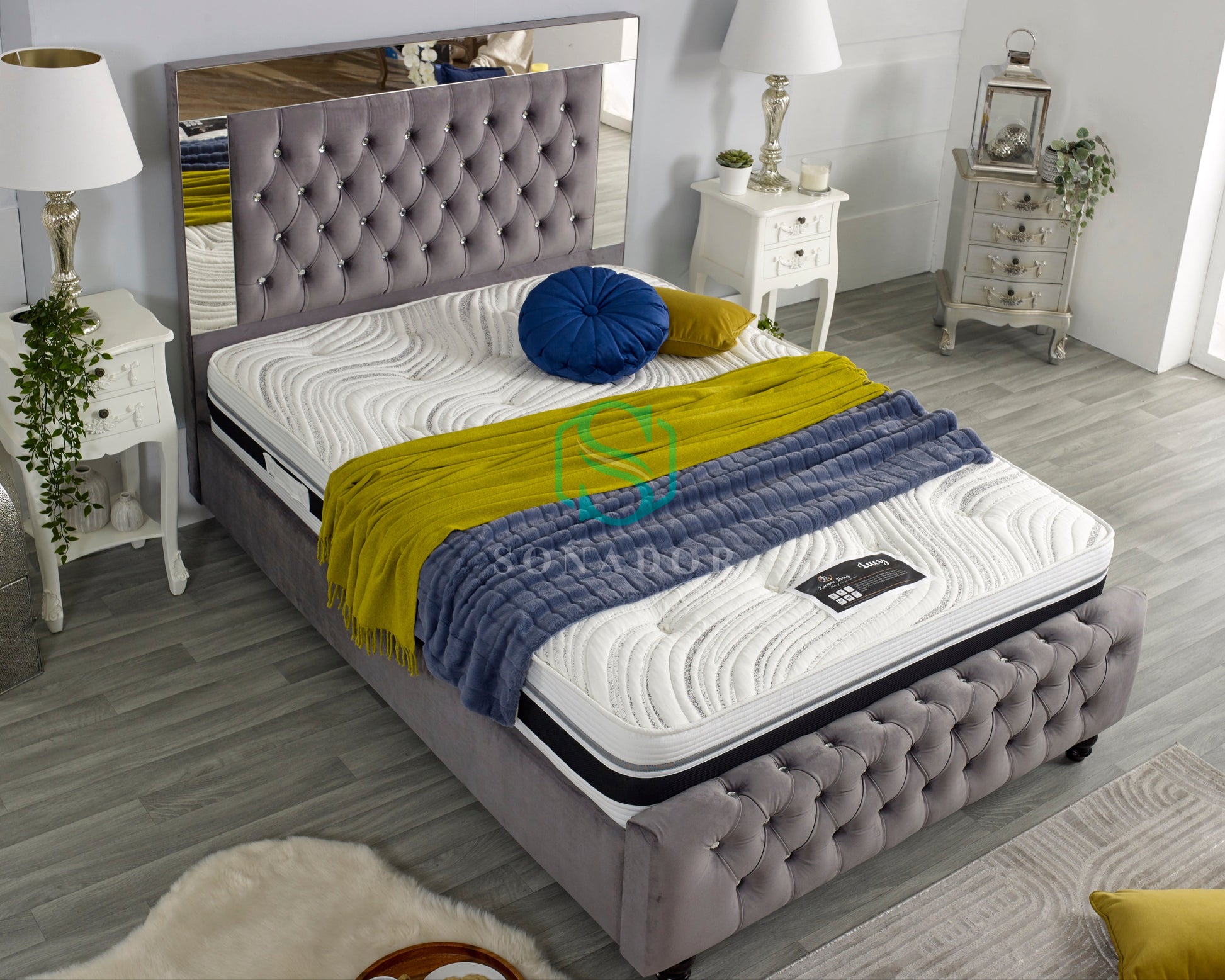The Mia Bed Frame is a stunning, modern piece that adds elegance and sophistication to any bedroom. Its sleek, contemporary design features mirrors seamlessly integrated into the frame, wrapping around the edges to create a reflective, luminous effect. The mirrors catch and reflect light, making the room feel brighter and more spacious. The clean lines and minimalistic style of the bed frame allow it to complement a variety of bedroom decor, from luxurious to minimalist. The Mia Bed Frame not only serves as a functional piece of furniture but also as a statement of timeless beauty and modern luxury. Perfect for those who appreciate fine craftsmanship and a touch of glamour in their space.