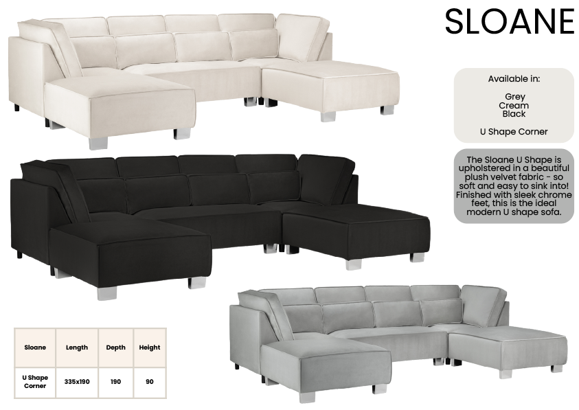 Sloane U shaped corner sofa is an excellent experience, with the ultimate comfort and incredible value with the Sloane Sofa. Featuring foam-filled seat cushions and a solid wood frame, this U-shaped corner sofa offers deep and relaxed seating. Additional bolster cushions provide even more comfort, making it the perfect addition to any living space.